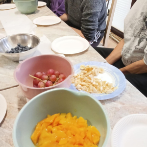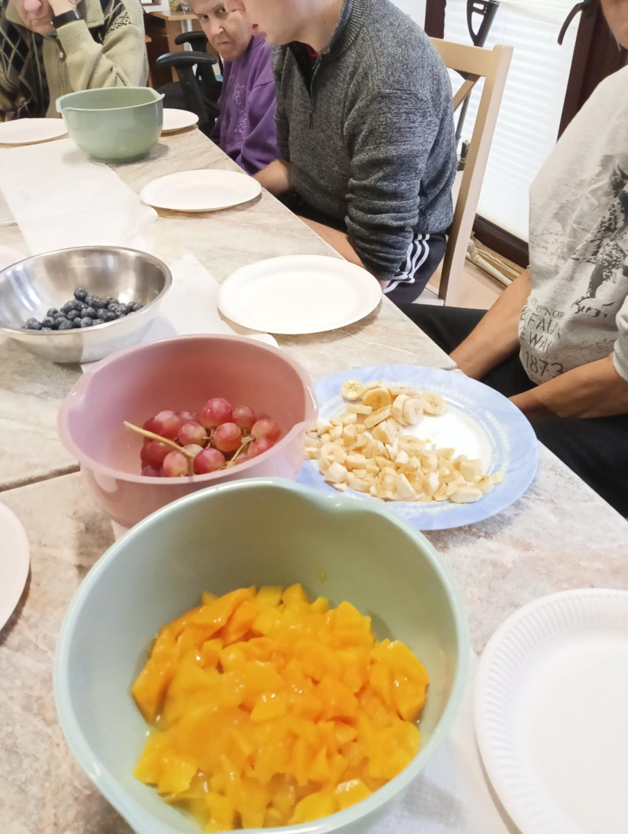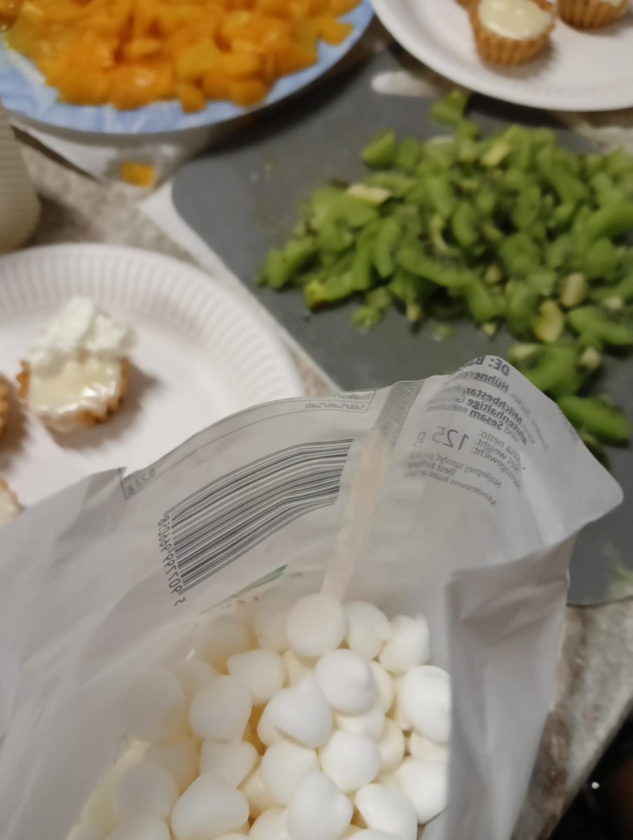 Było obieranie bananów, krojenie mango i brzoskwiń, mycie borówek, dekorowanie mandarynkami, bitą śmietanką i bezikami.